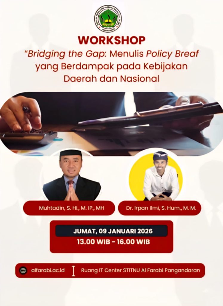 ALFARABI.AC.ID | Sekolah Tinggi Ilmu Tarbiyah Nahdlatul Ulama (STITNU) Al Farabi Pangandaran kembali memperkuat peran akademisnya dalam kancah kebijakan publik melalui penyelenggaraan Workshop Penulisan Policy Brief bertajuk “Bridging the Gap”. Kegiatan ini dilaksanakan pada Jumat, 9 Januari 2026, dengan fokus utama memberikan pemahaman mendalam mengenai tata cara penyusunan dokumen kebijakan yang mampu memengaruhi regulasi di tingkat daerah maupun nasional.